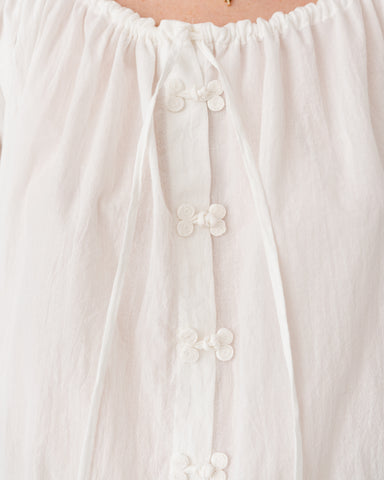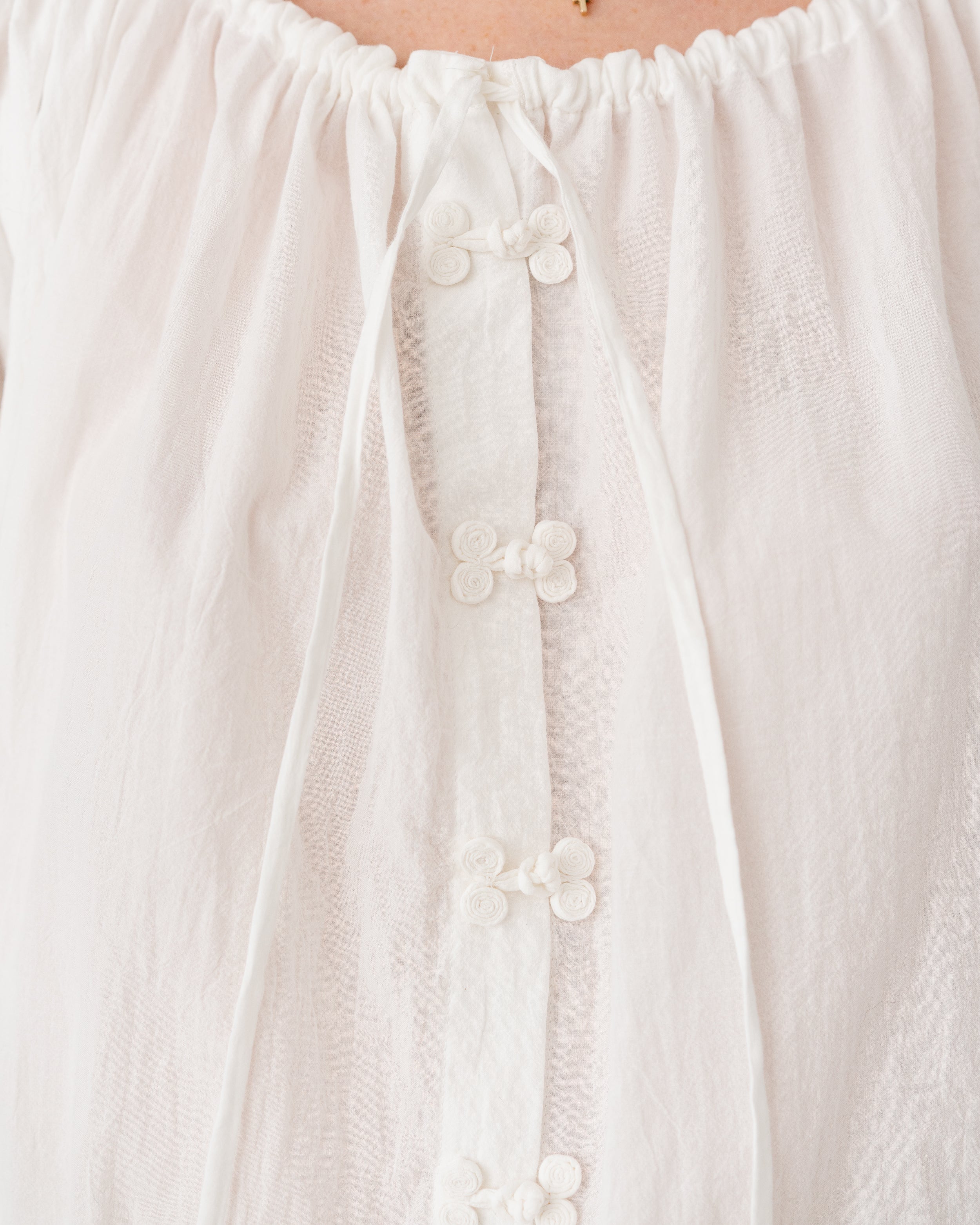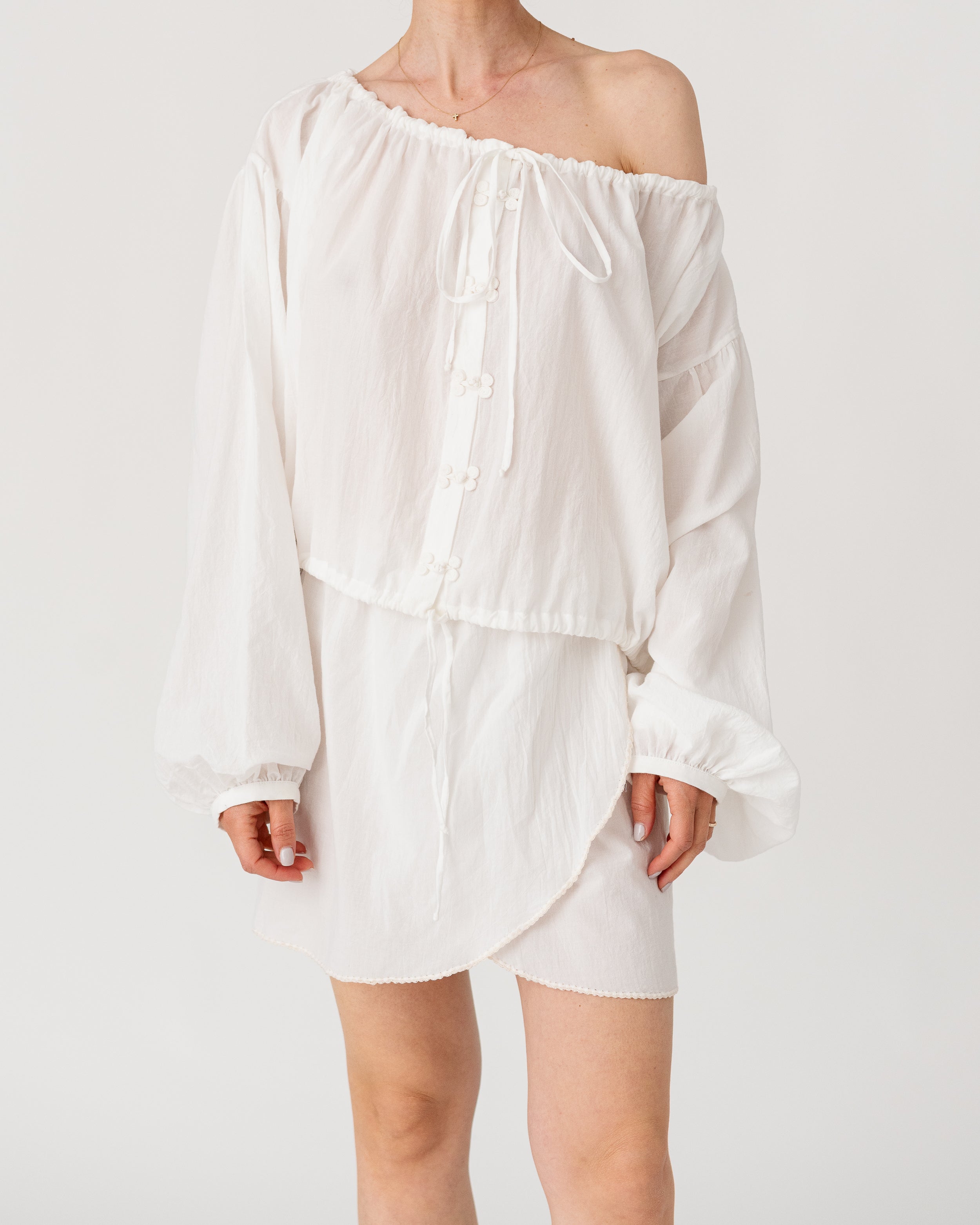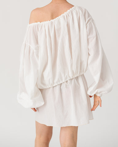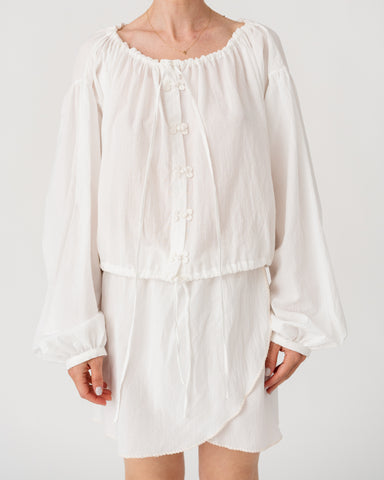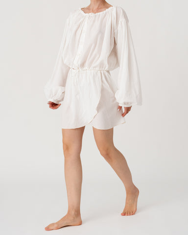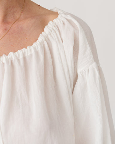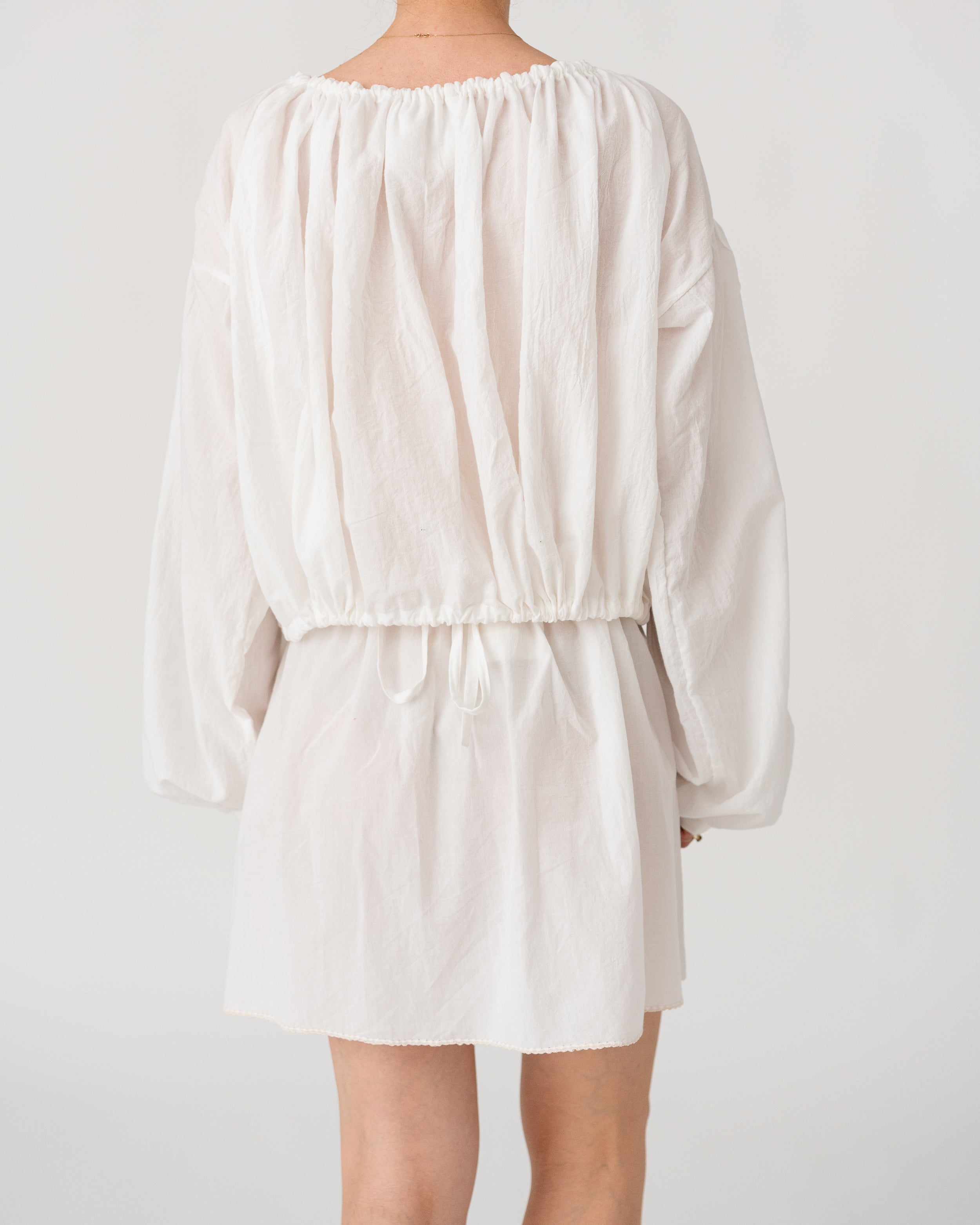 Gathered neckline and waistband, with voluminous sleeves for an effortless, romantic silhouette.