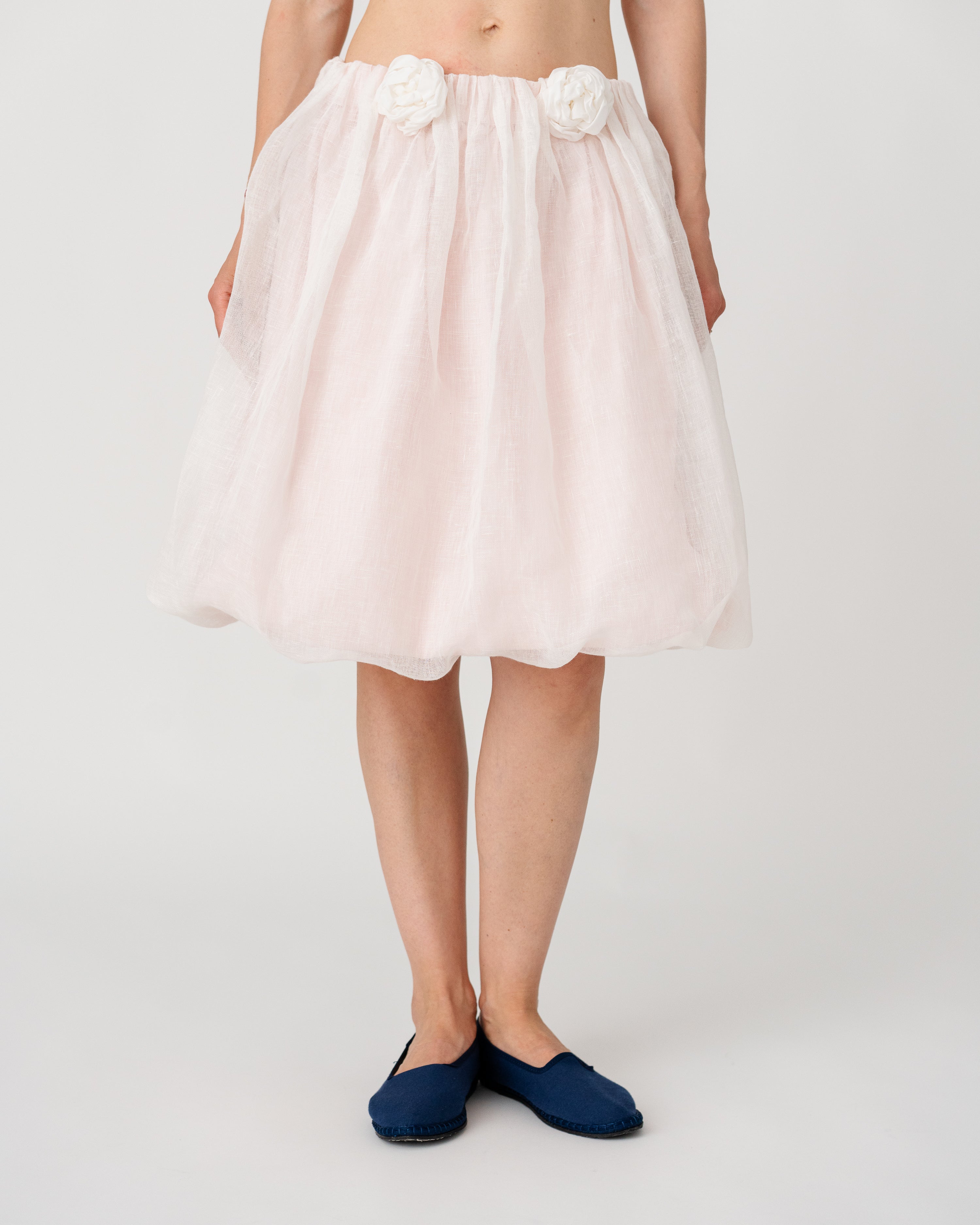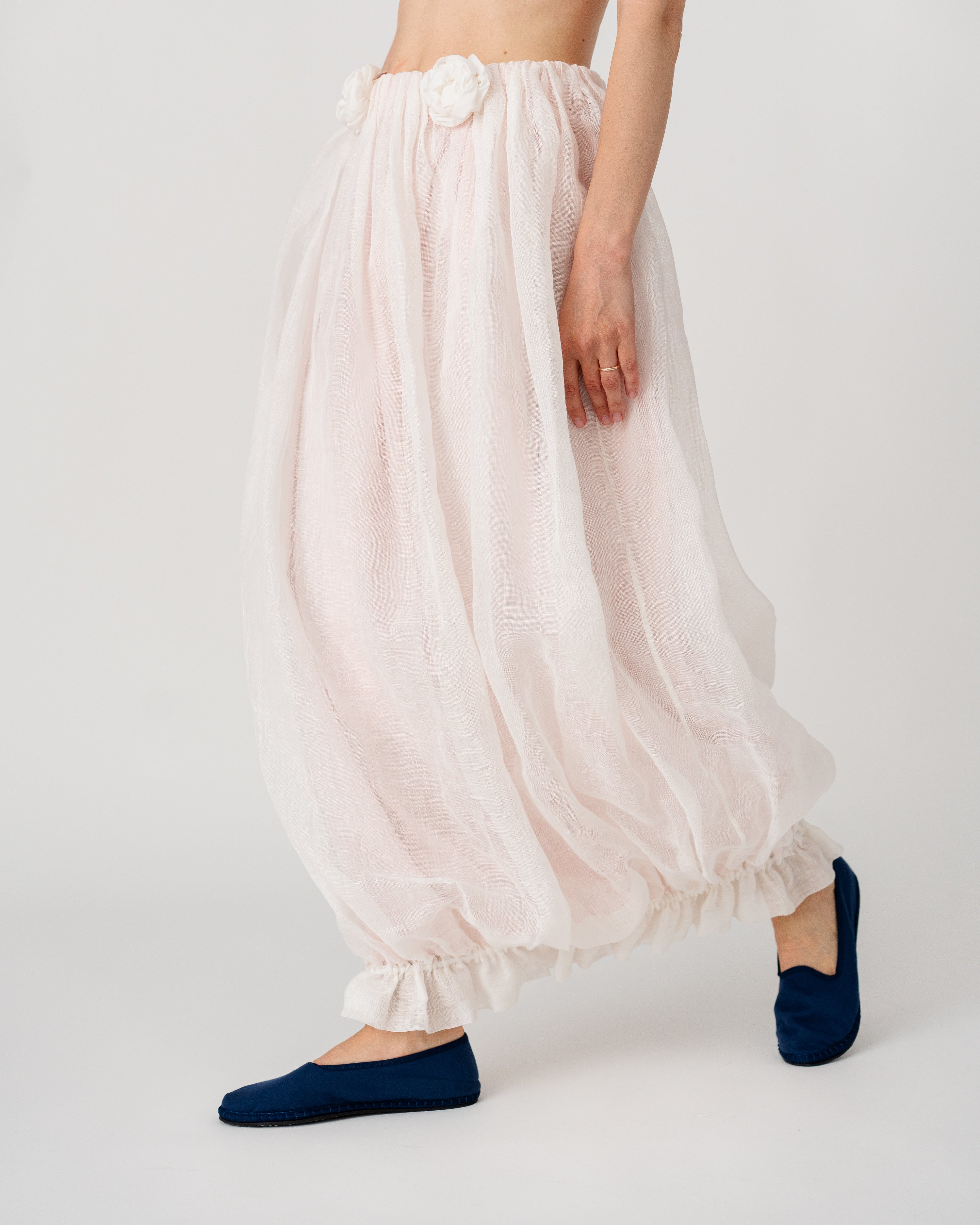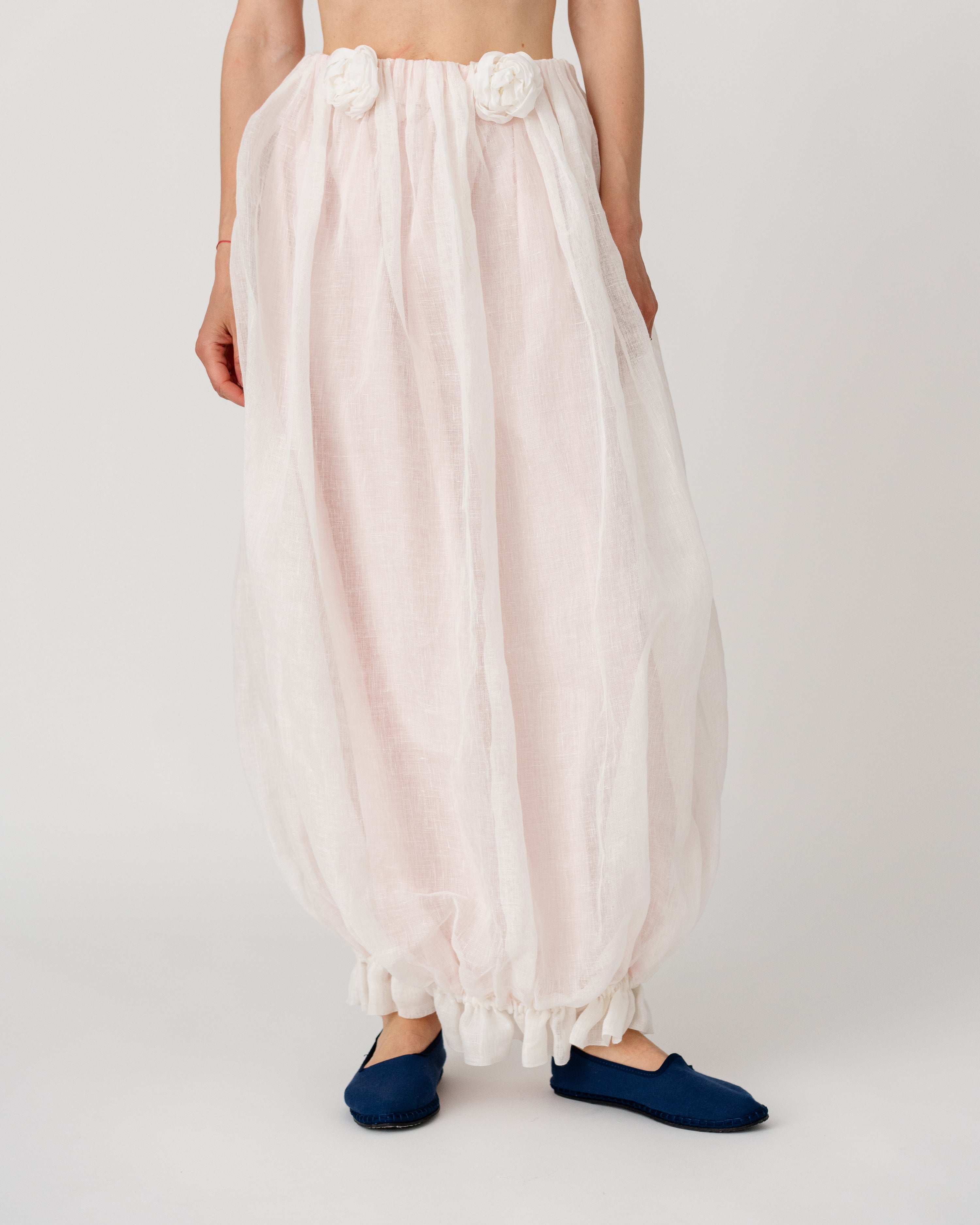 • Softly gathered waistband adorned with handcrafted floral appliqués