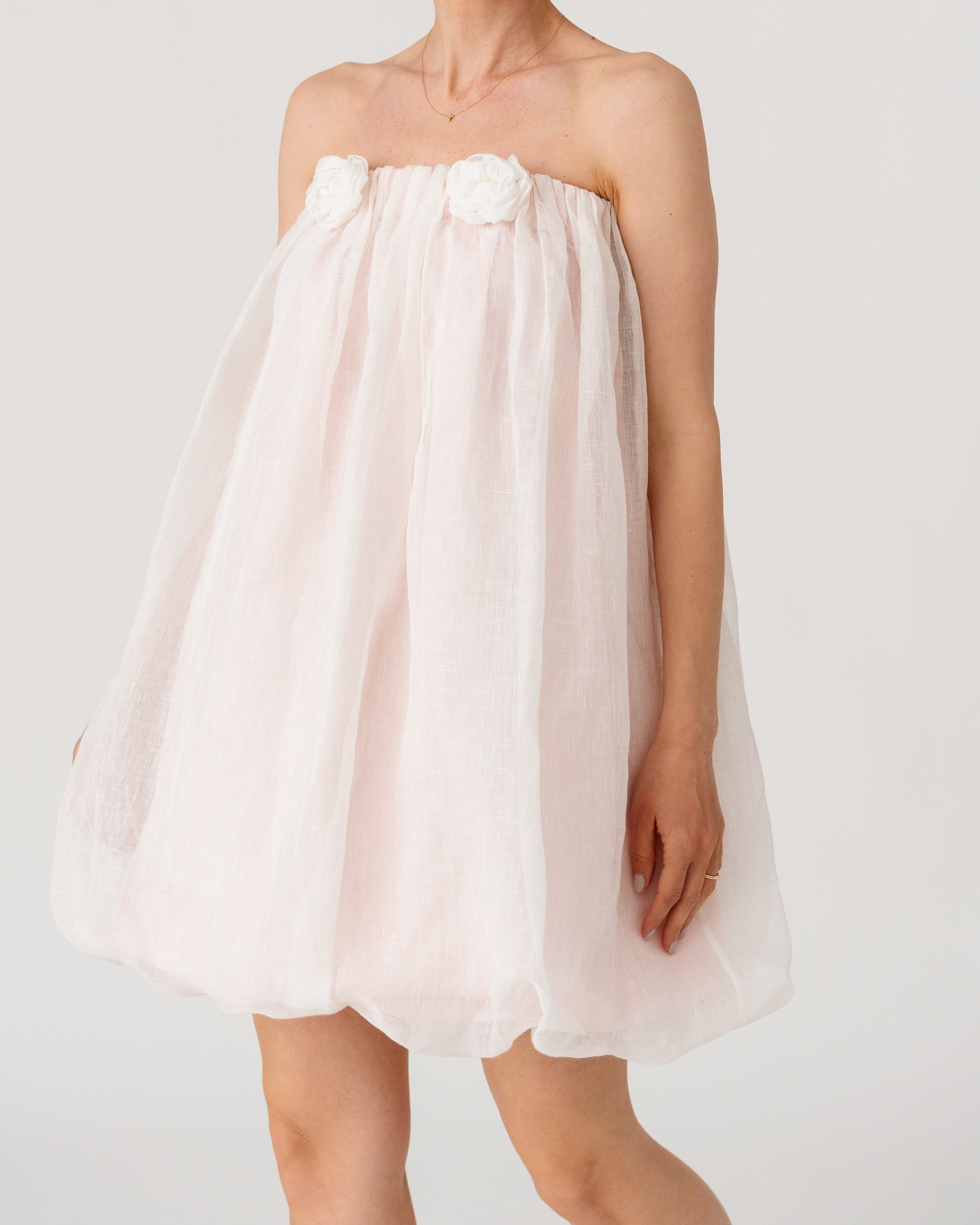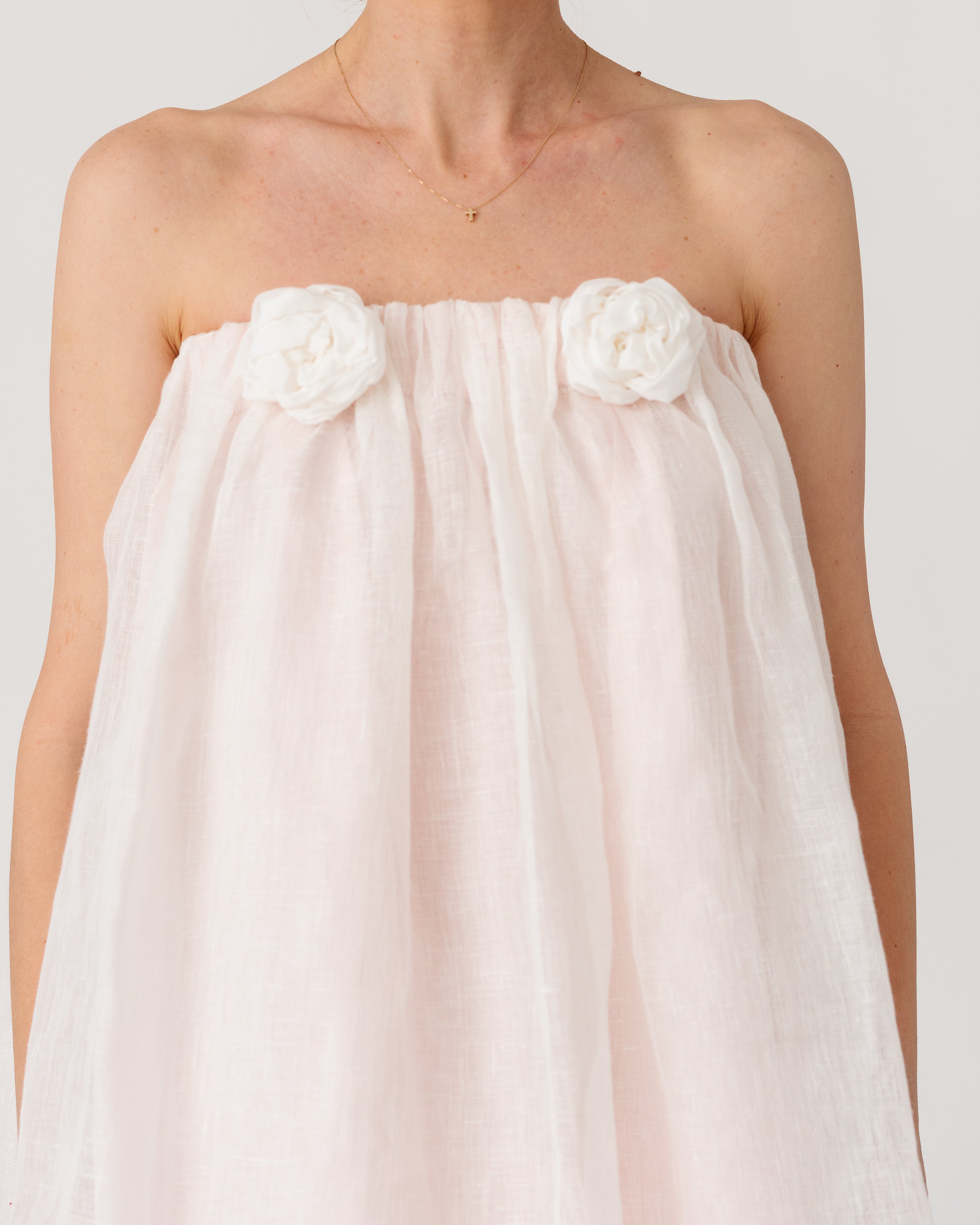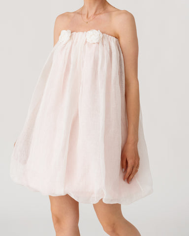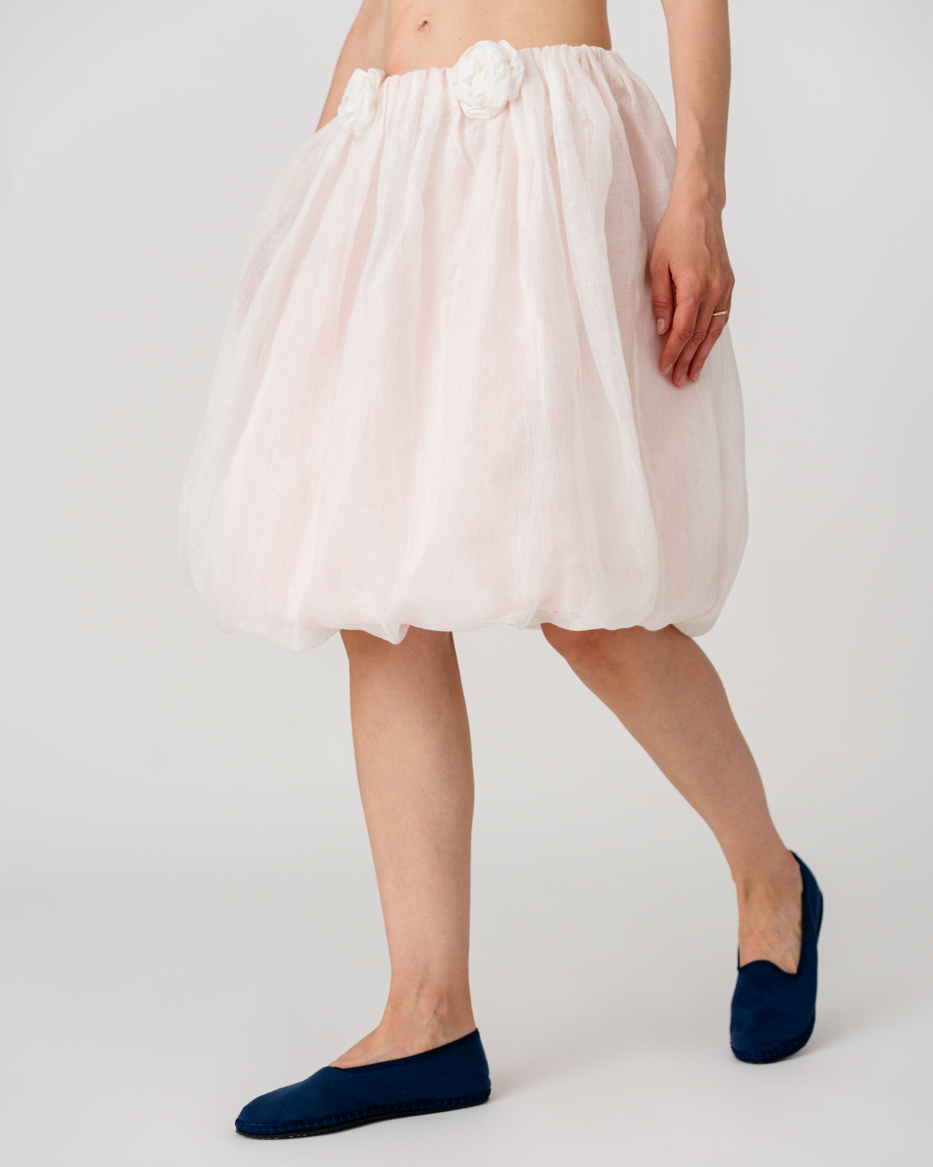 • Softly gathered waistband adorned with handcrafted floral appliqués