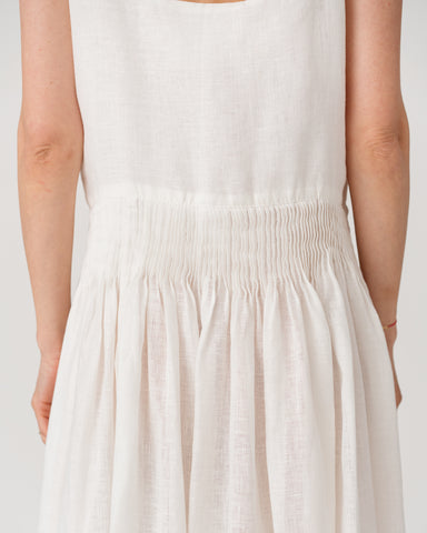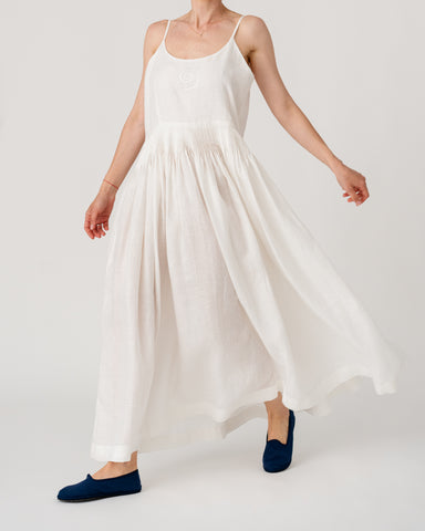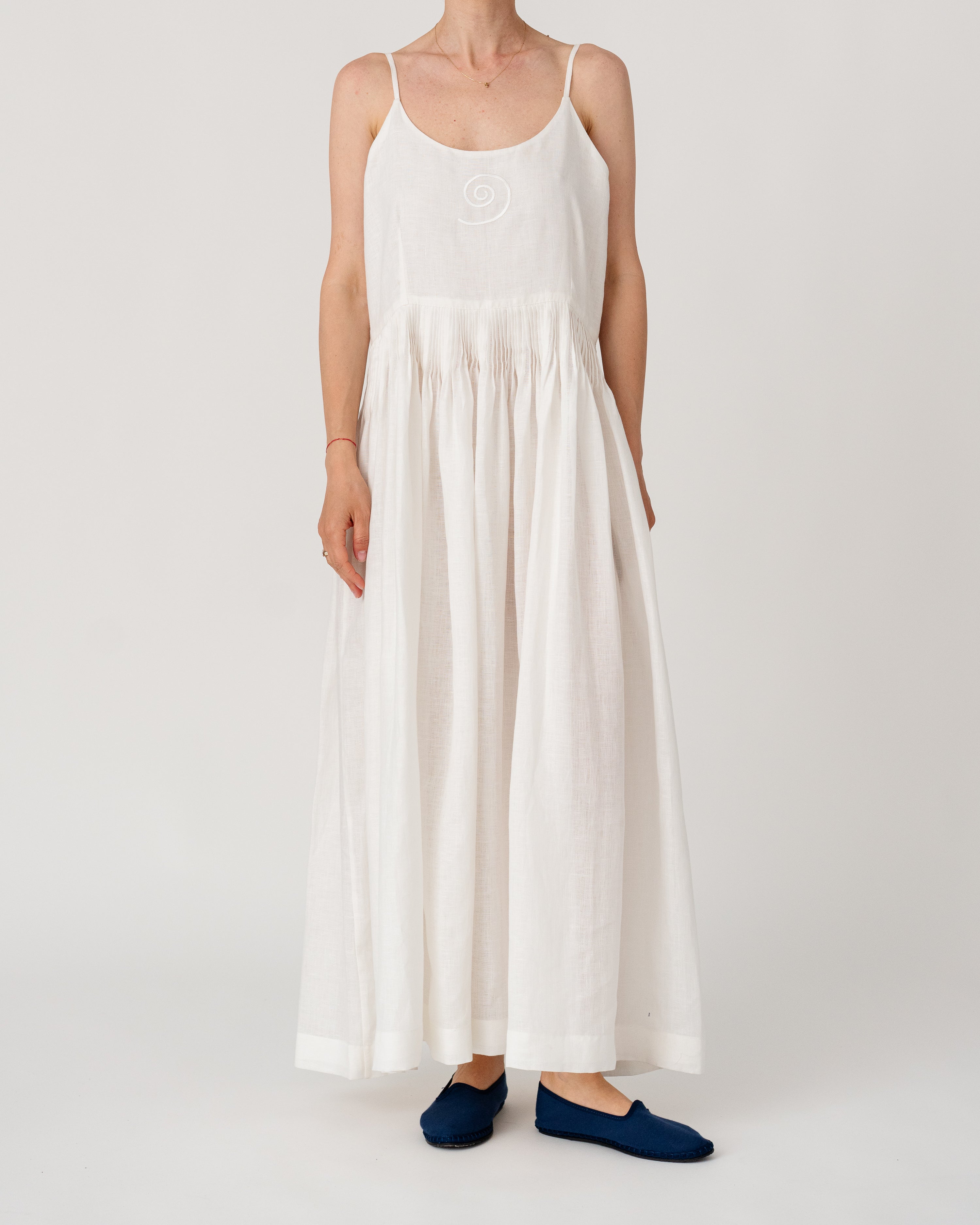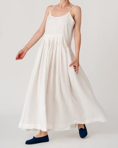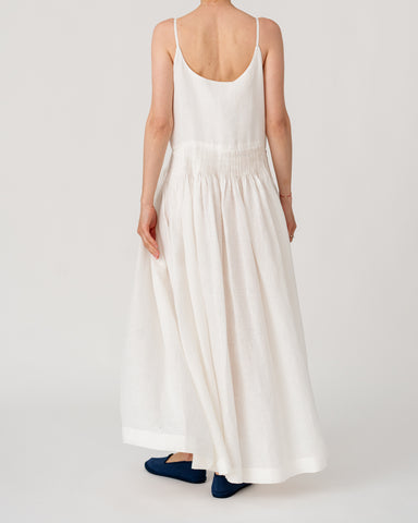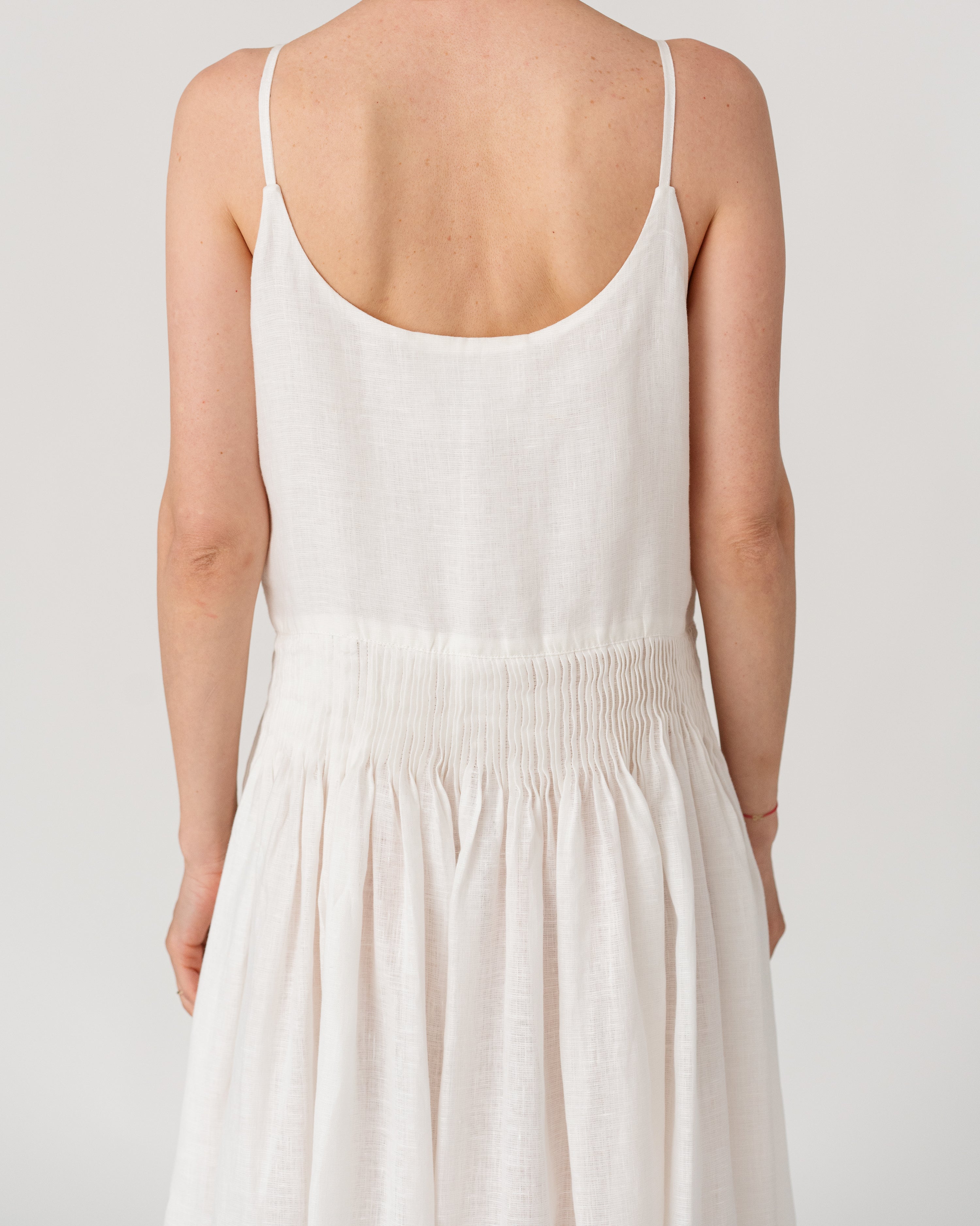 Slim straps with a softly gathered waist creating an airy, elegant silhouette