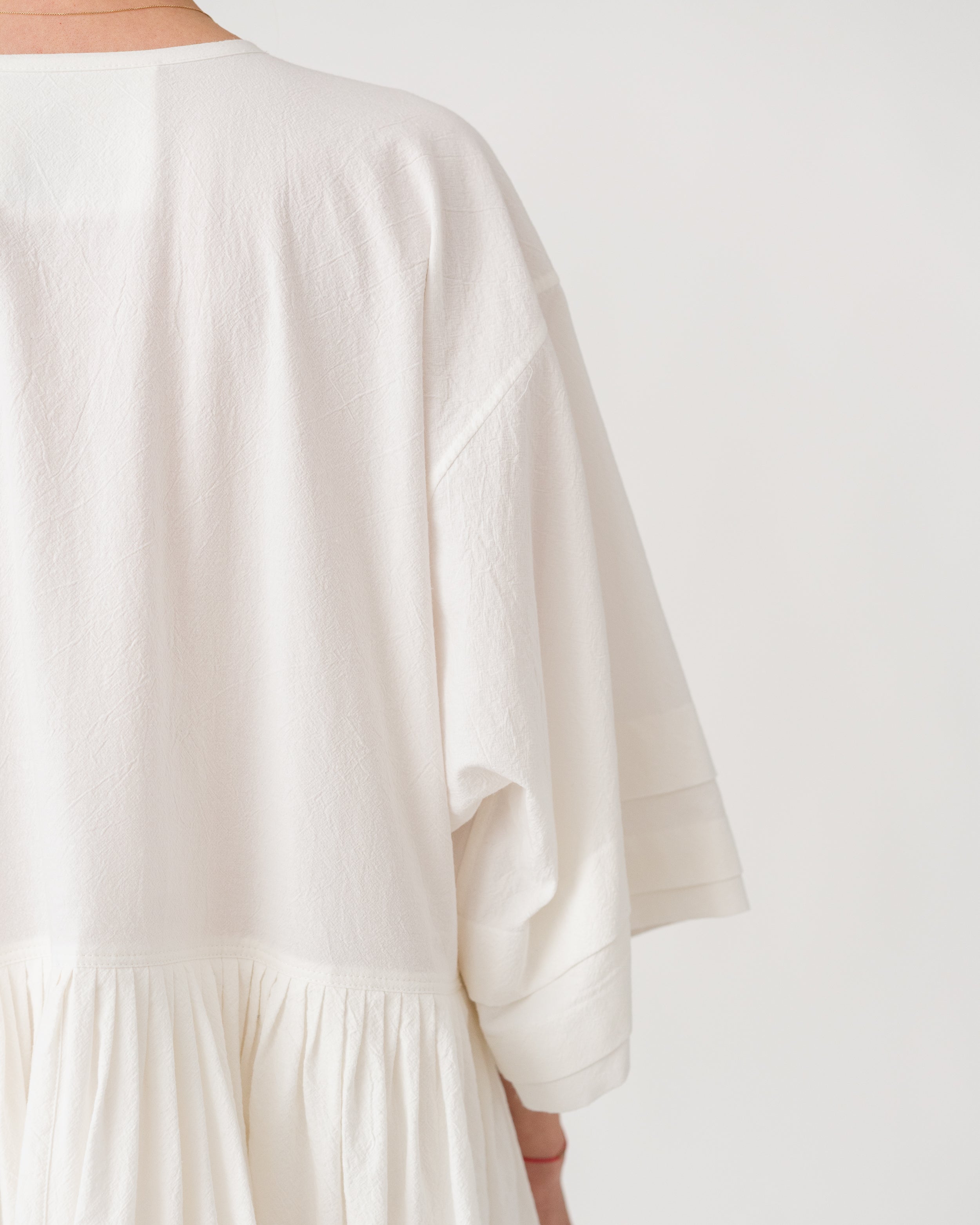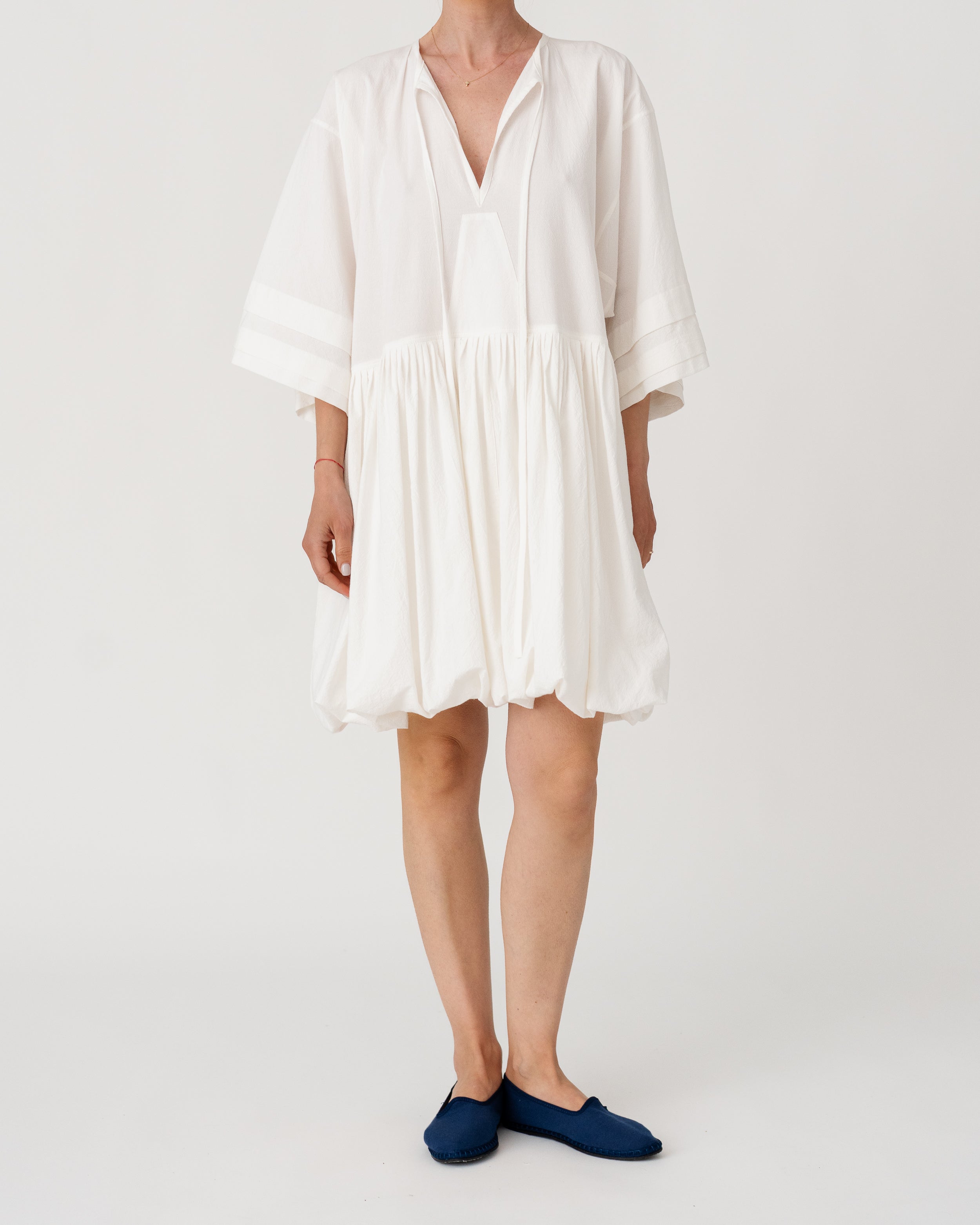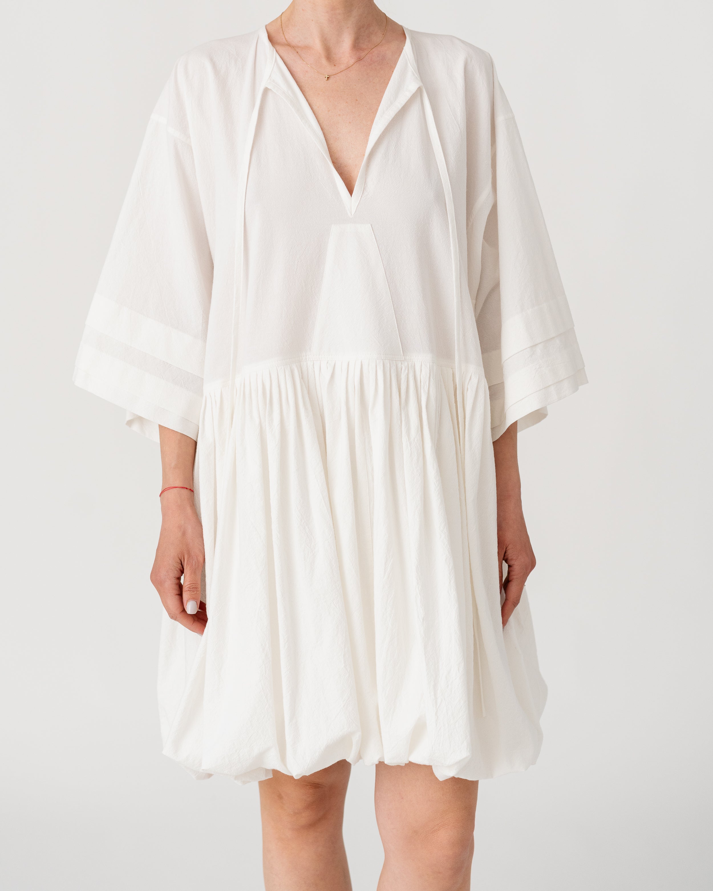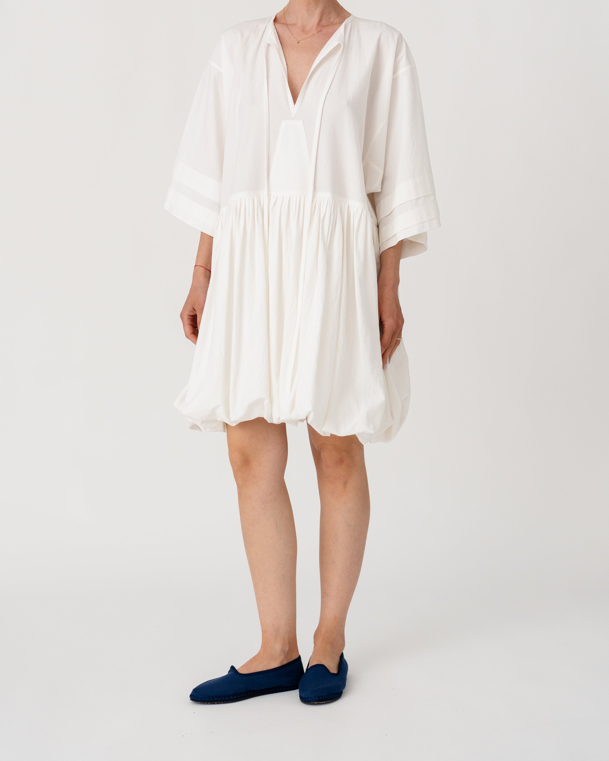 Soft V-neckline with gathered waist and wide sleeves creating a fluid, effortless silhouette