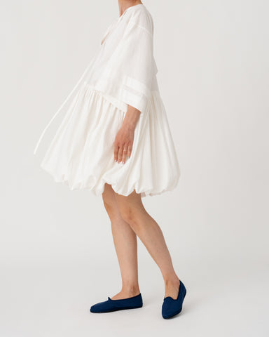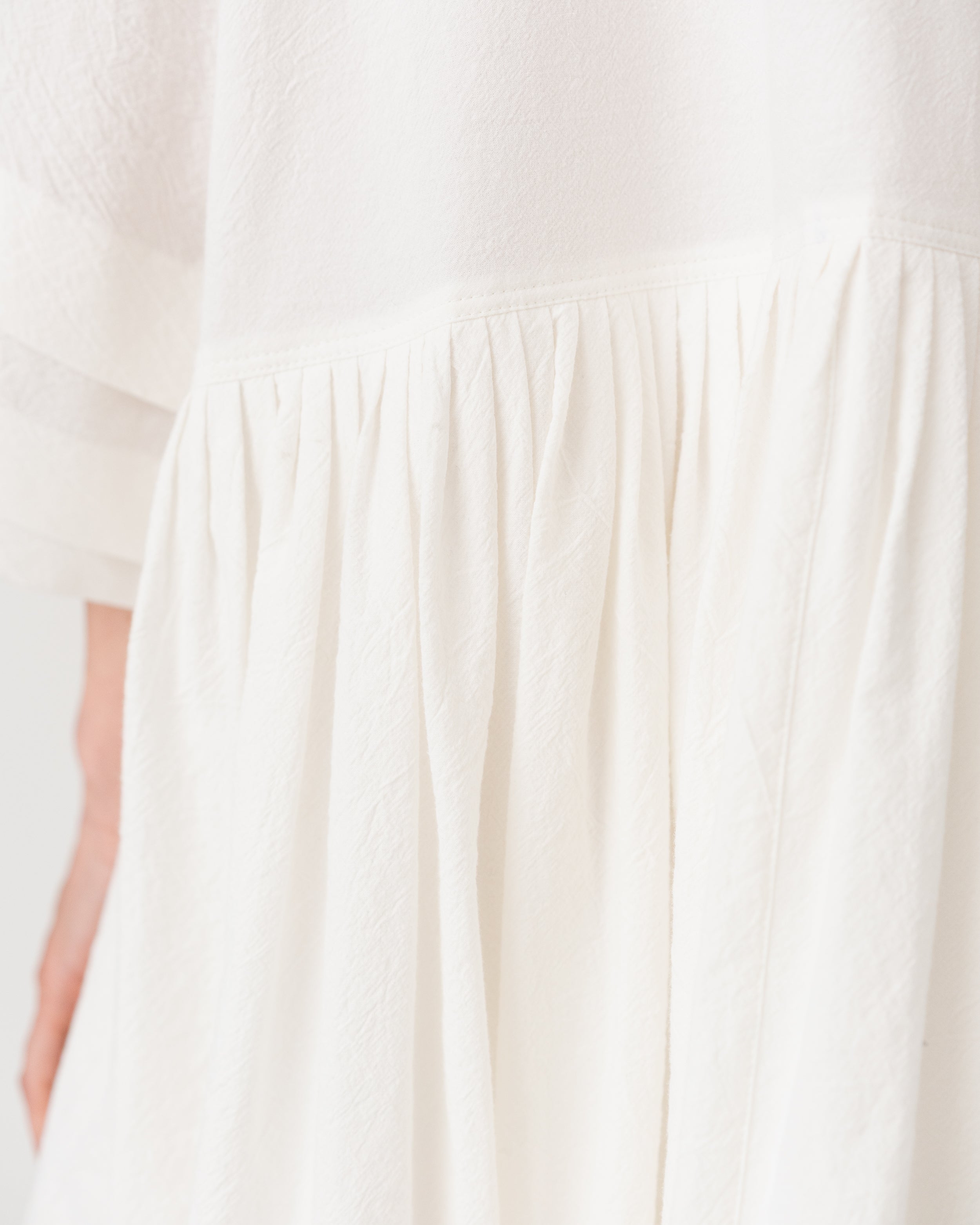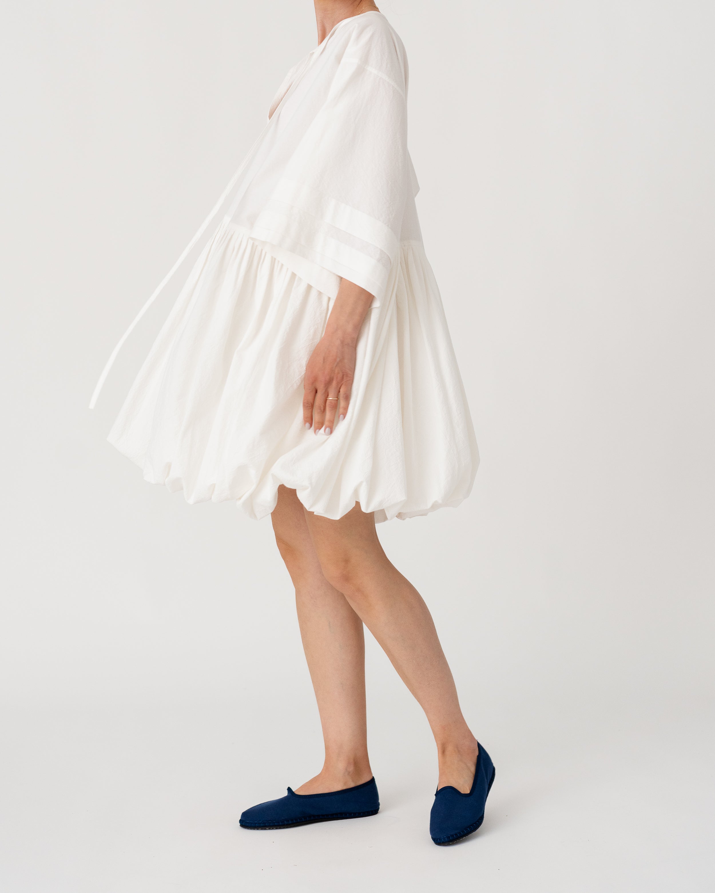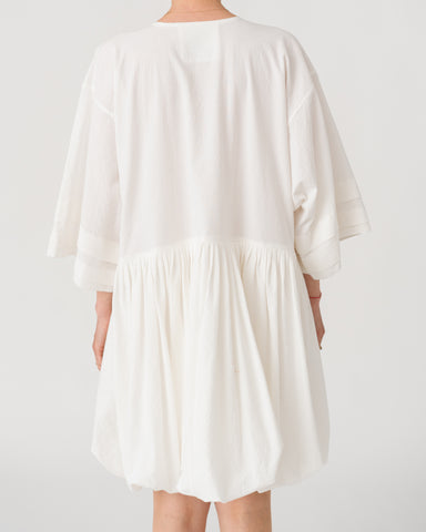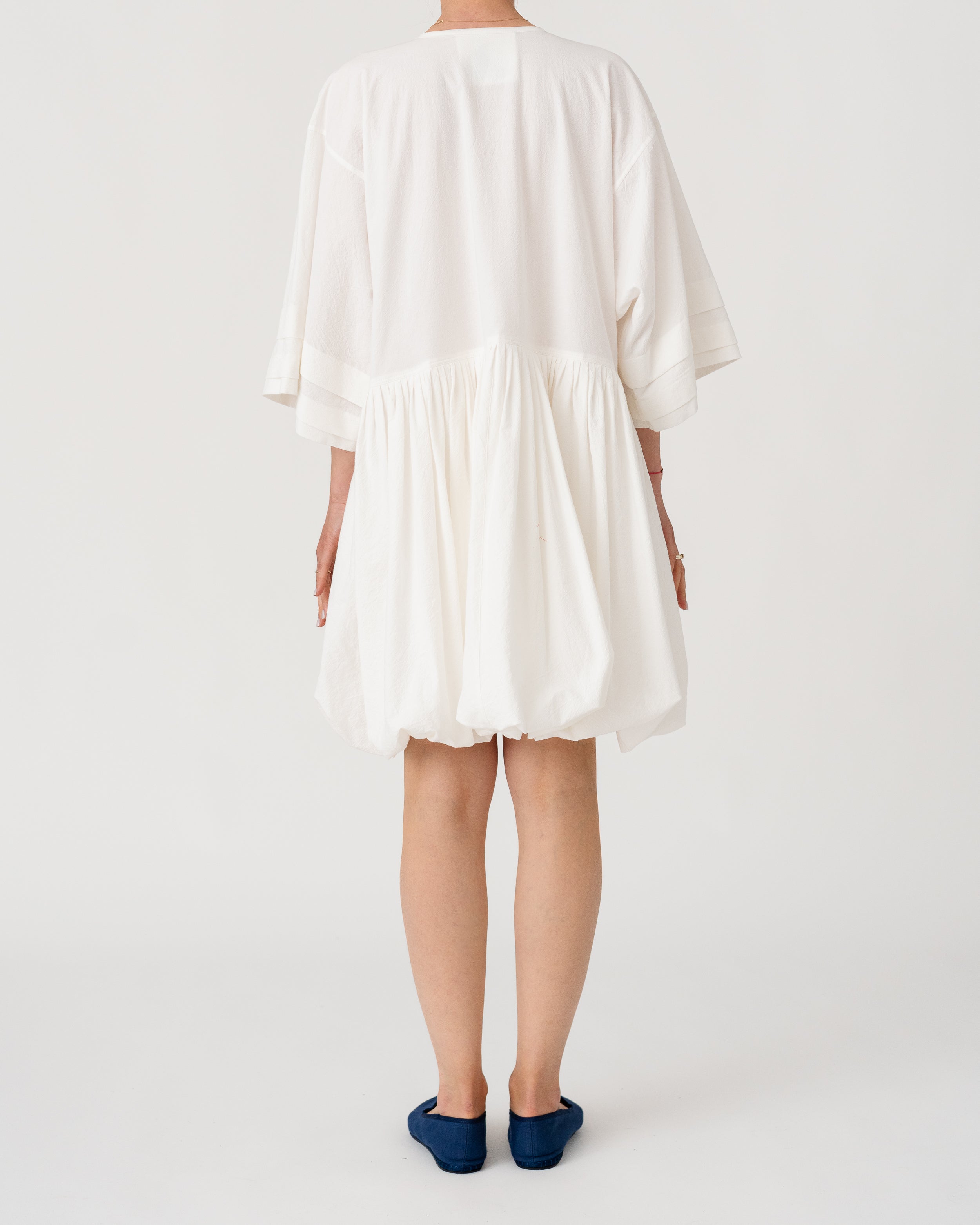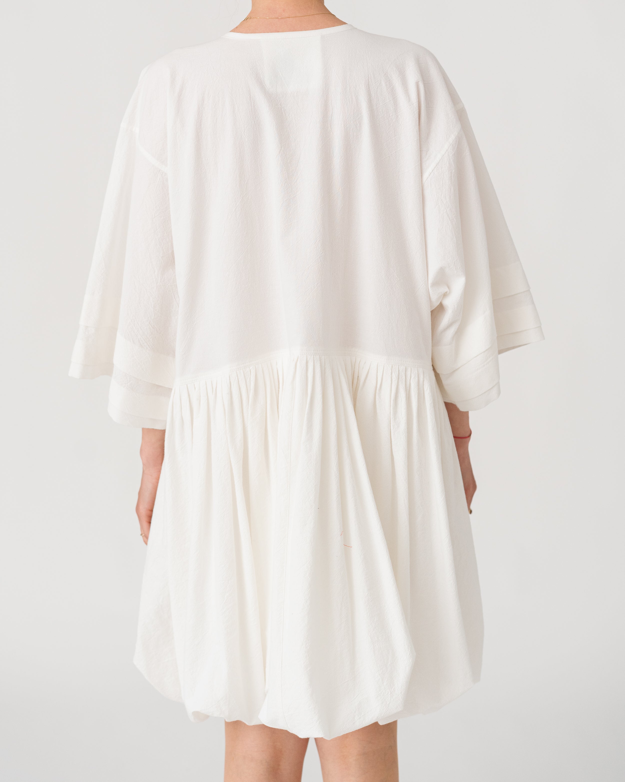 Soft V-neckline with gathered waist and wide sleeves creating a fluid, effortless silhouette